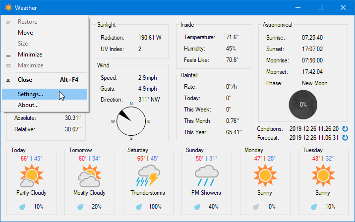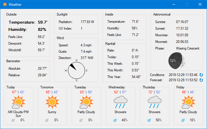 After setting up a weather station on my roof, I decided to write a Windows program to monitor the weather conditions. I also added support for it to grab the 6-day forecast from Weather Underground and to display current astronomical conditions (sunrise/sunset, moonrise/moonset, and moon phase). It worked well for me, but I decided to make further enhancements to make it useful for others and release it to the public.