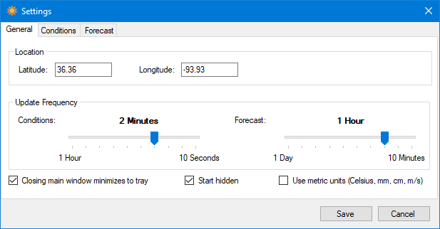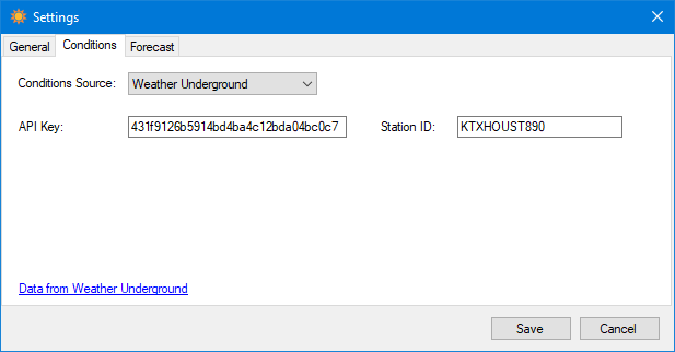 The conditions location is determined based on the latitude and longitude entered on the first tab.