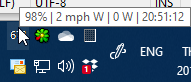 A system tray icon is provided, showing the current temperature. Hovering over it shows the humidity, wind speed and direction, solar radiation, and date the conditions were last updated: